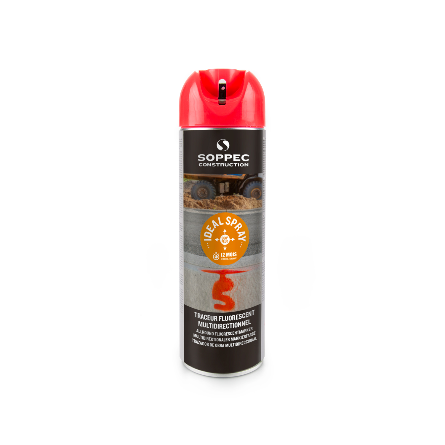 Der Spezialsprühkopf mit 360°-Ventil ermöglicht ein problemloses Markieren in jeder Sprühlage, egal ob Boden-, Wand- oder Deckenmarkierung. Die provisorische Markierung ist bis zu zwölf Monate sichtbar. Er eignet sich ideal für den Tunnelbau und alle Handwerker (Elektriker, Installateure, etc.).