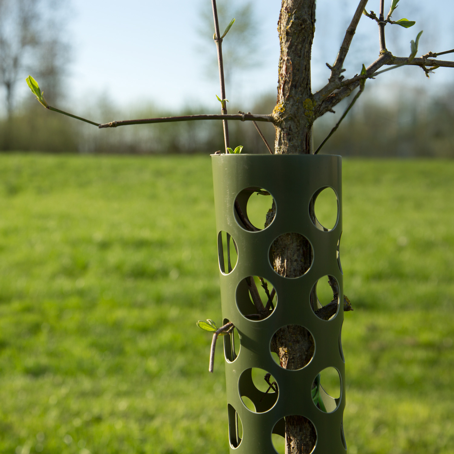 Dieser vielbewährte und zuverlässige Baumschutz ist ein vielfach gelochtes Kunststoffrohr aus hartem PVC, das seitlich zur Rohrachse aufgeschnitten ist. Es hat einen Durchmesser von 85 mm, am unteren Ende befindet sich ein Blindteil von ca. 10 bis 15 cm Höhe – zum Schutz gegen Mäuse.