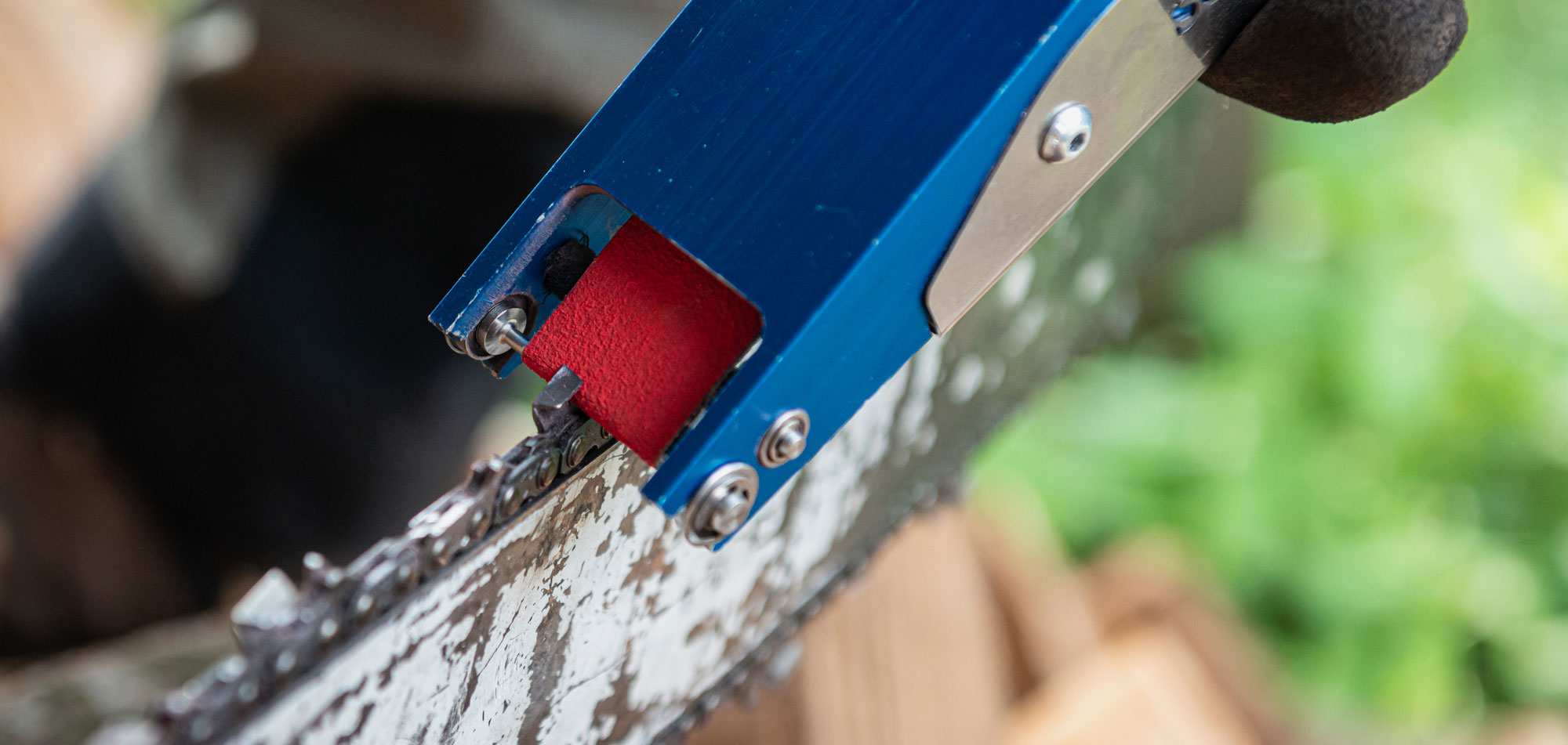 Die Schneidezähne und Tiefenbegrenzer werden mit diesem Schärfgerät gleichzeitig in einem Arbeitsgang gefeilt. Der Wechsel vom rechten zum linken Zahn erfolgt durch Wenden des Gerätes, wofür kein Umbau erforderlich ist. Im Lieferumfang sind Schärfgerät, Tiefenbegrenzerfeile und zwei Rundfeilen enthalten.